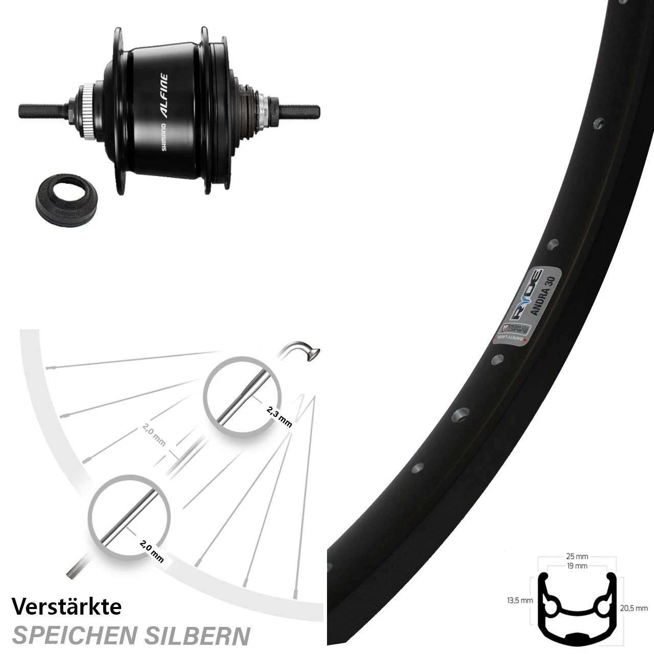26 Zoll Ryde Andra 30 Disc Hinterrad Shimano Alfine 8-Gang mit verstärkten Speichen