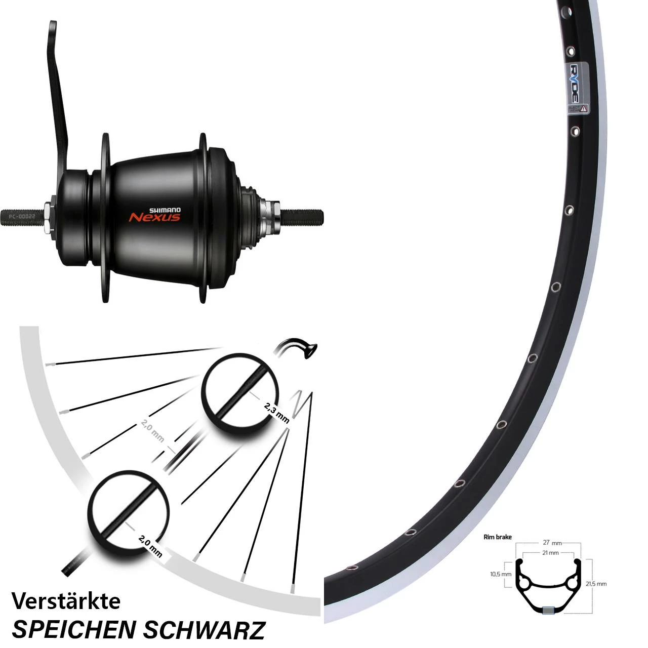 Technische Daten Hinterrad Ryde ZAC 421 Felgenbremse schwarz und Nabe Shimano SGC3001-7C schwarz