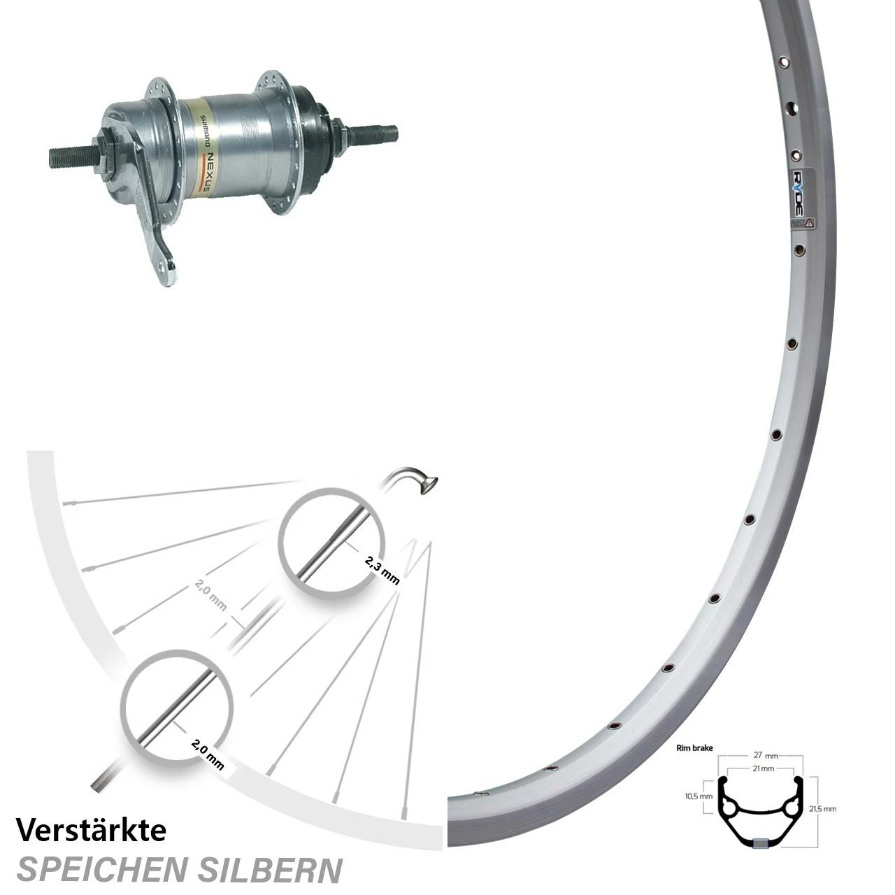Technische Daten Hinterrad Ryde ZAC 421 Felgenbremse silbern und Nabe Shimano SG3C41A2068 silber