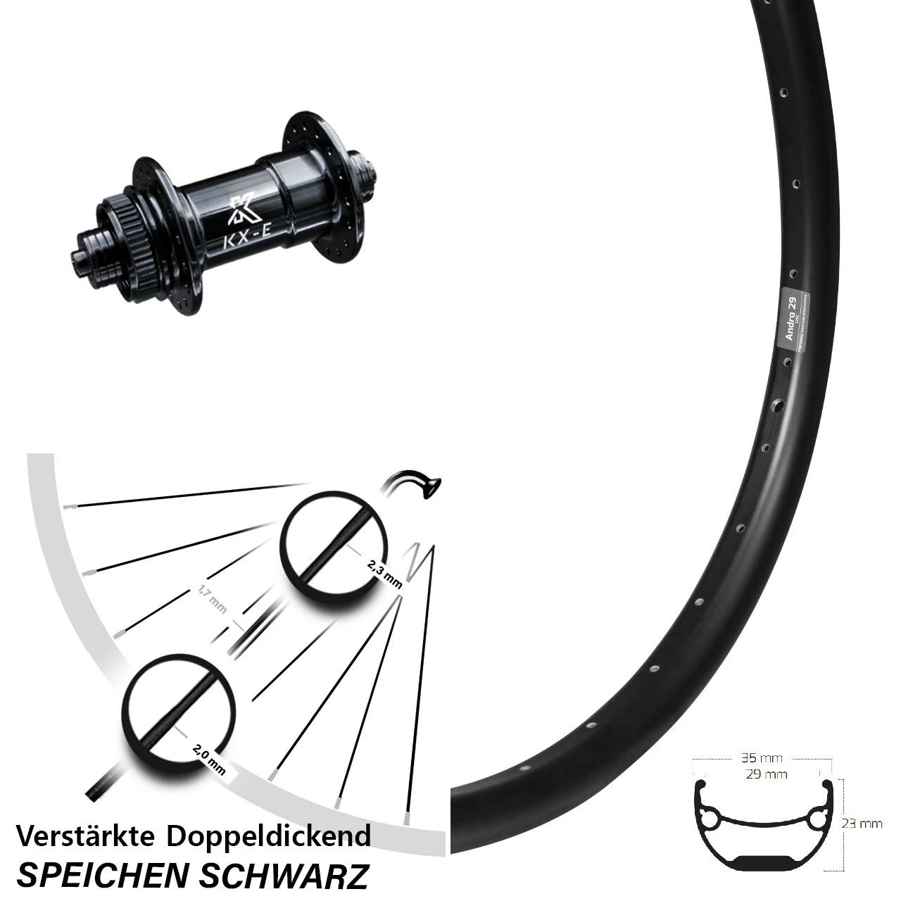 Technische Daten Vorderrad Ryde Andra 29 Disc schwarz mit Nabe KX-E Vorderradnabe Centerlock 5/100 schwarz