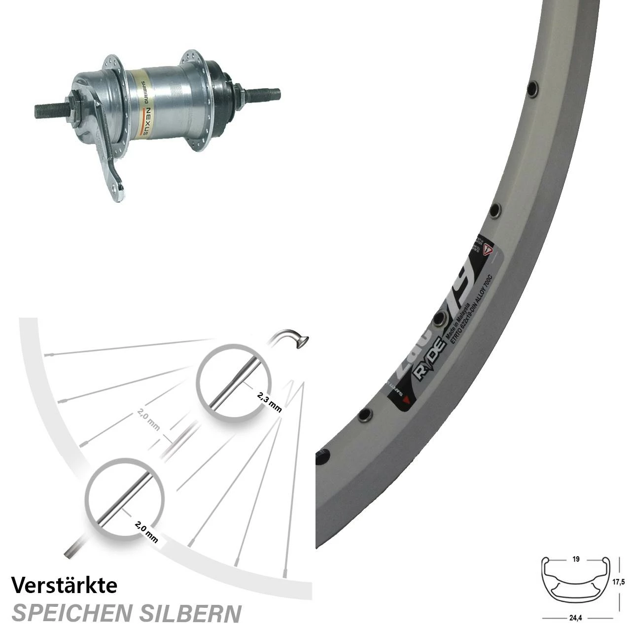 Technische Daten Hinterrad Ryde ZAC 19 Felgenbremse silbern und Nabe Shimano SG3C41A2068 silber