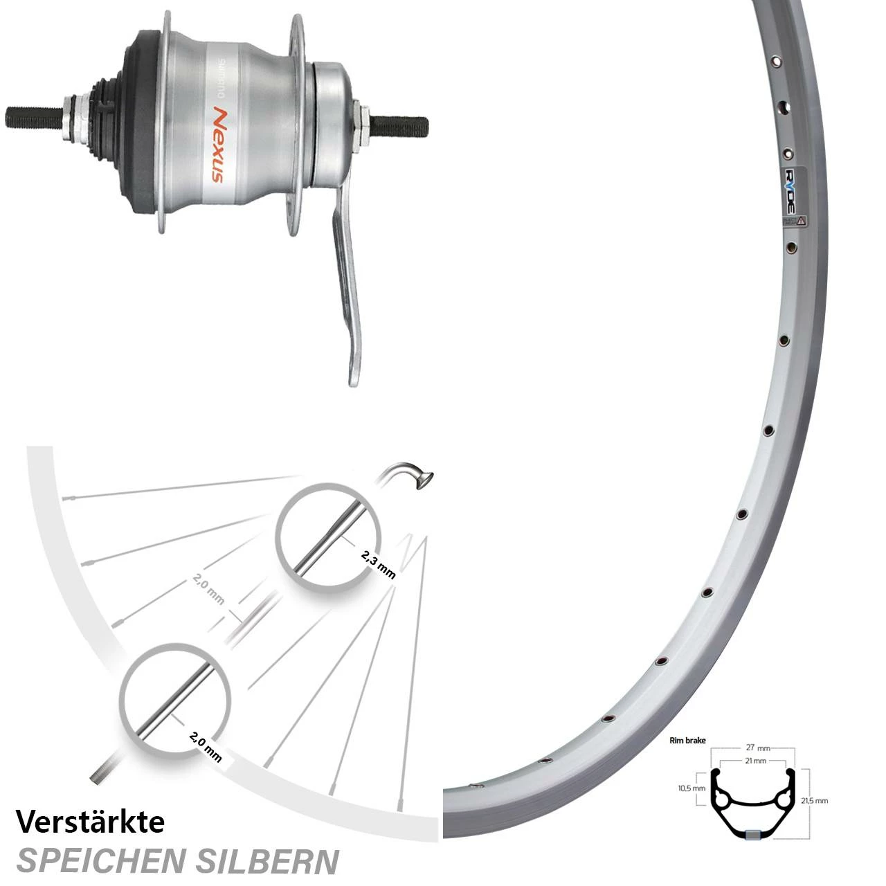 Technische Daten Hinterrad Ryde ZAC 421 Felgenbremse silbern und Nabe Shimano Nexus 7-Gang SG-7C30 silbern