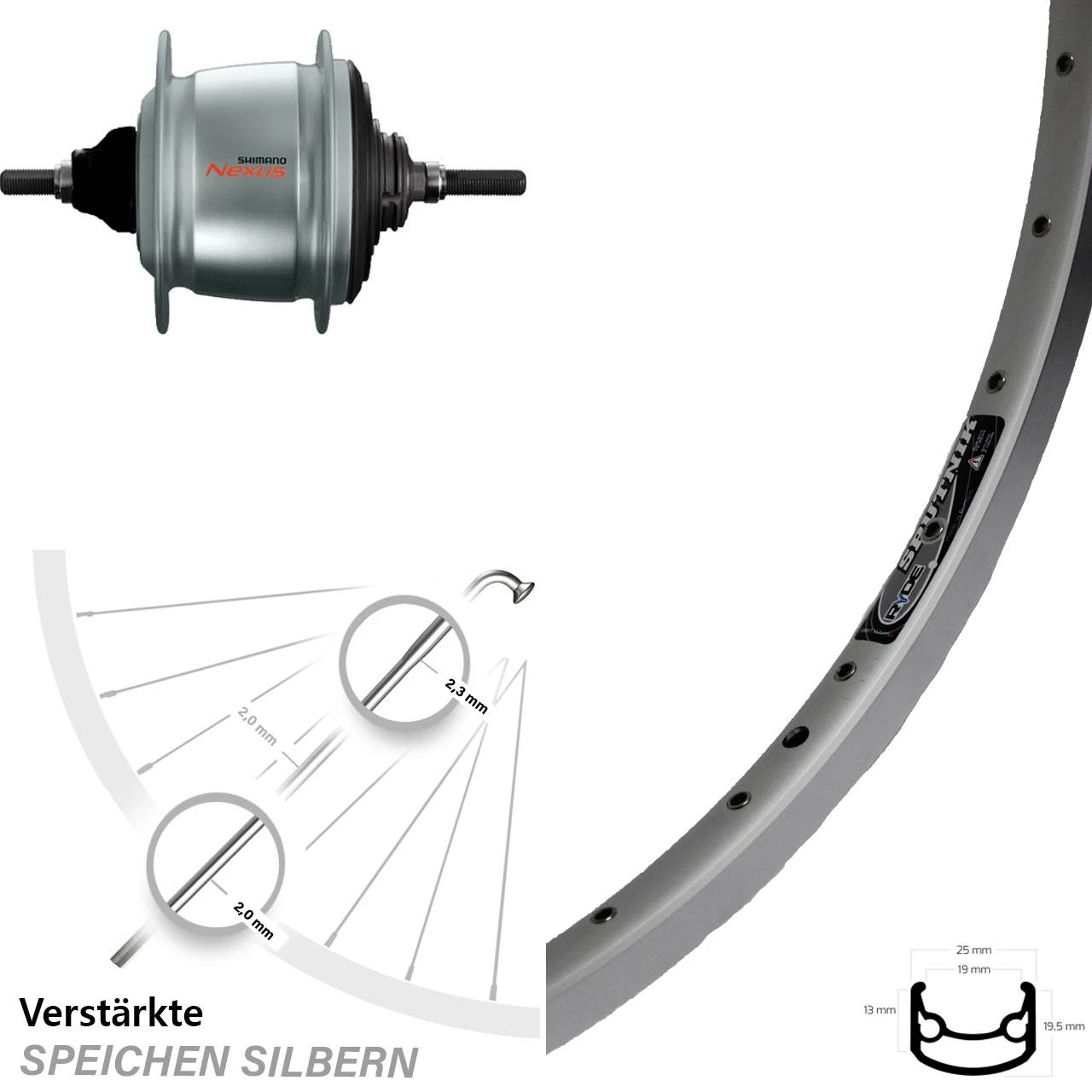 - 36 silberne Sapim Speichen mit Speichenstärke 2,34/2,0 mm Edelstahl verstärkt – besonders stabile und verstärkte Dickendspeiche mit 2,34 mm Durchmesser im kritischen Bereich der Nabe