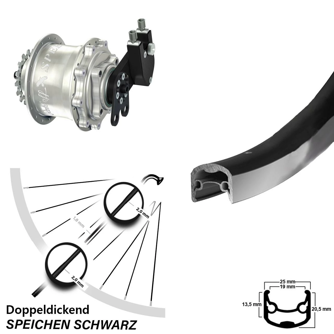 Speichen: Diese Doppeldickendspeiche aus rostfreiem und hochwertigen Edelstahl von der Firma Sapim aus Belgien ist eine besonders leichte Fahrradspeiche. Sie ist speziell für leichte Laufräder geeignet. Sapim hat hier einen hervorragenden Kompromiss zwischen Stabilität und Gewicht gefunden. Diese leichte Doppeldickendspeiche ist im besonders bruchgefährdeten Bereich der Nabe und am Gewindeende mit 2,0 mm besonders stark ausgeführt. Im Mittelteil weist sie „schlanke“ 1,8 mm auf, was Gewicht spart. Zudem fängt die Speiche dank ihrer guten Elastizität und der hohen Festigkeit am Mittelteil mit 1300 N/mm2 auch hohe Zug- und Druckkräfte hervorragend ab. Die endverstärkte Edelstahl- Fahrradspeiche mit einem Durchmesser von 2,0 mm, 1,8 mm und 2,0 mm kommt beim Rennrad und MTB/Mountainbike zum Einsatz.