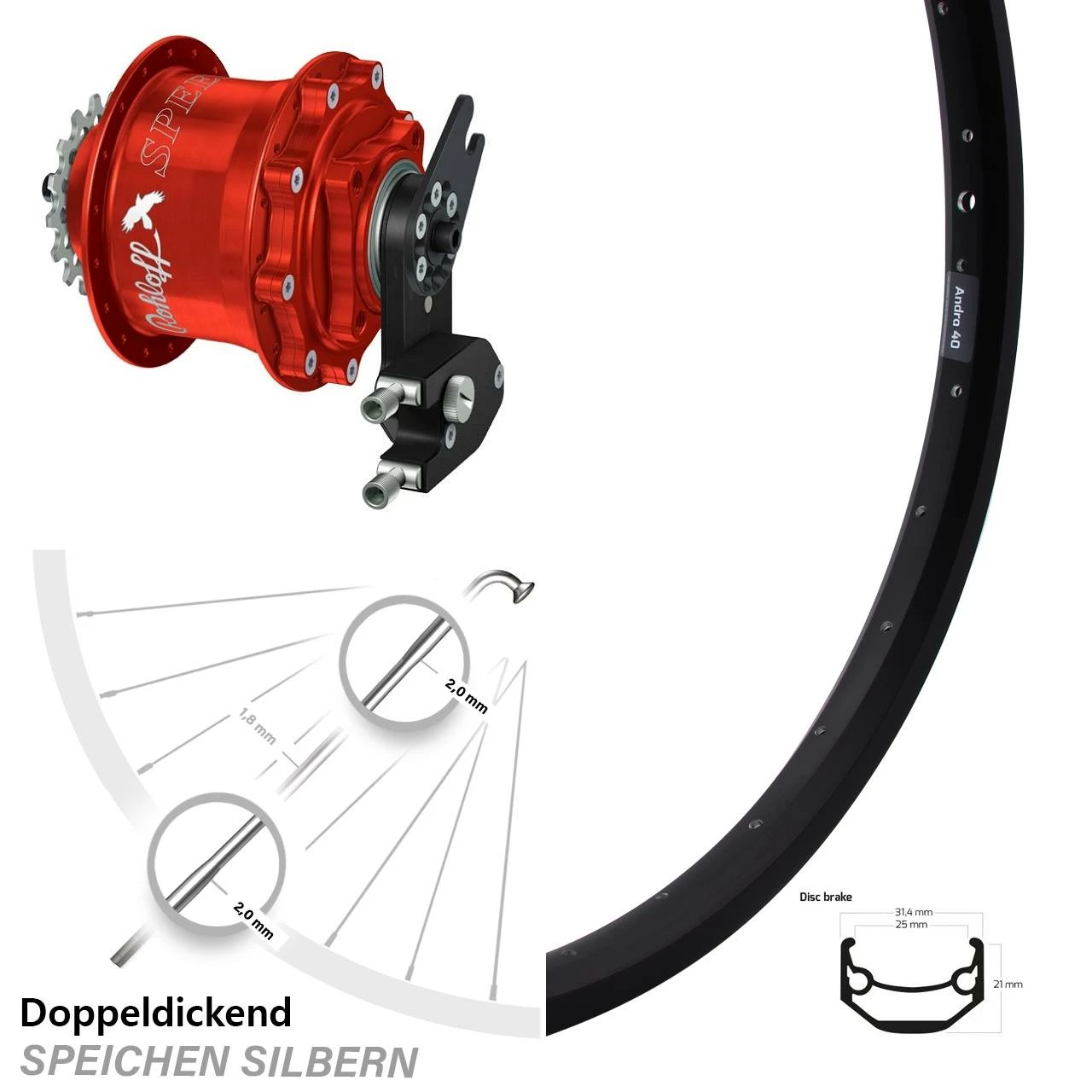 Technische Daten Hinterrad Ryde Andra 40 Disc schwarz und Nabe Rohloff Speedhub 500/14 CC DB OEM2 rot