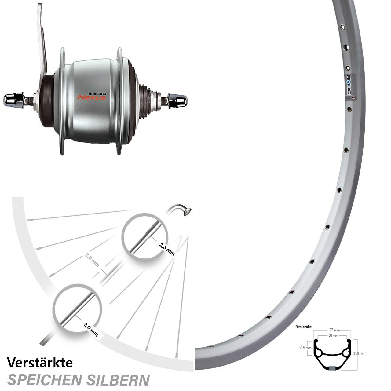 Technische Daten Hinterrad Ryde ZAC 421 Felgenbremse silbern und Nabe Shimano SG-C6001-8C silbern