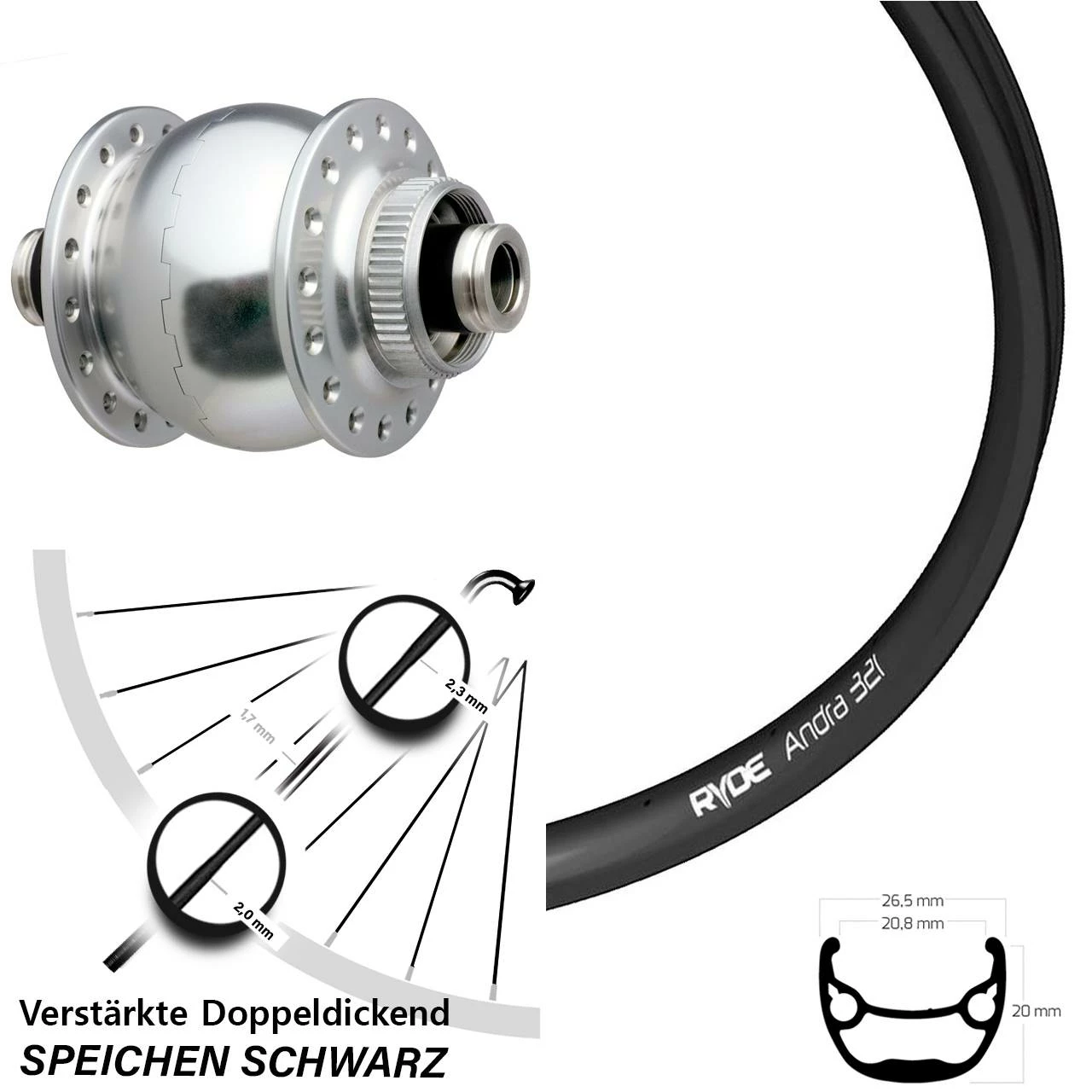 Technische Daten Vorderrad Ryde Andra 321 Disc schwarz & Nabendynamo SON 28 Disc Centerlock Steckachse silbern eloxiert