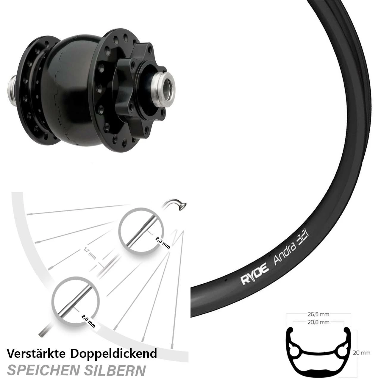 Technische Daten Vorderrad Ryde Andra 321 Disc schwarz & Nabendynamo SON 28-12 Disc 6-Loch schwarz